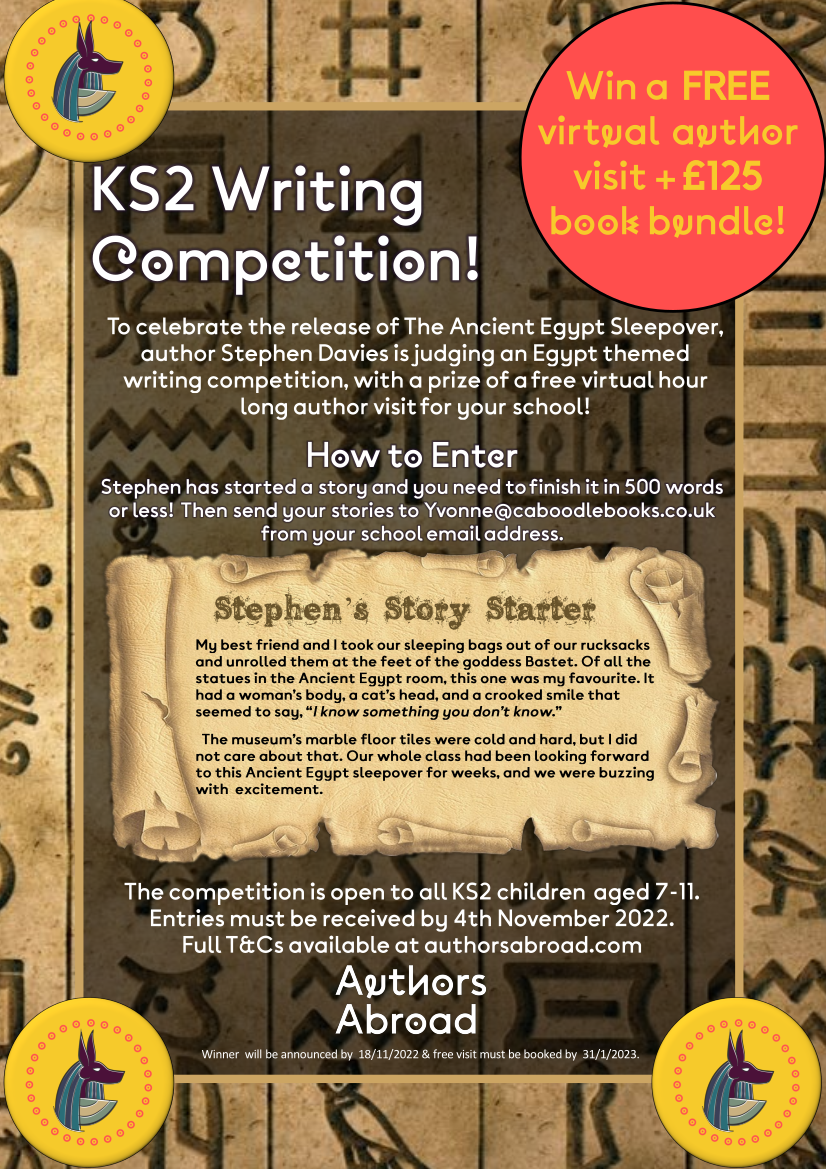 Be entered into a competition to win a free in person author visit with Stephen Davies by purchasing 30 copies of ‘The Ancient Egypt Sleepover’ from Authors Abroad.